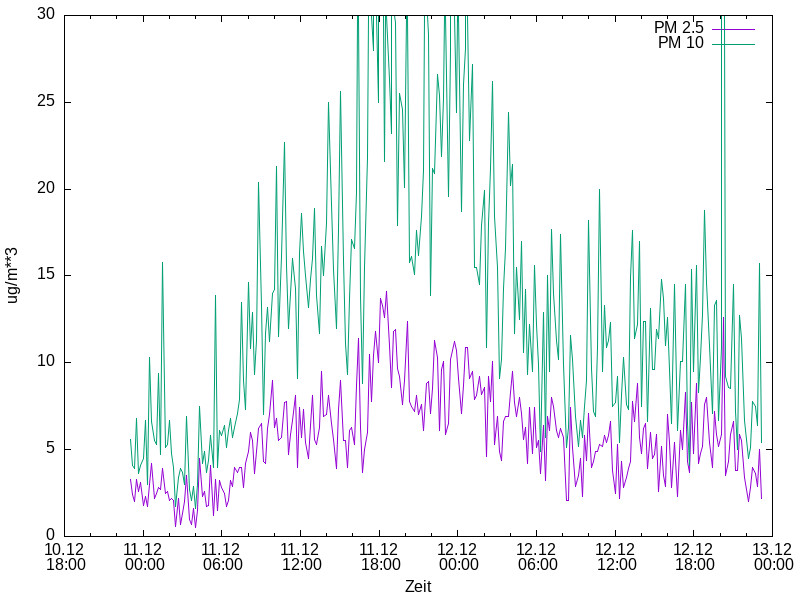 Feinstaubmessung aus meinem Speicherfenster: Verlauf der Werte vom PM2.5 und 10PM Messung: Feinstaub Verlauf |